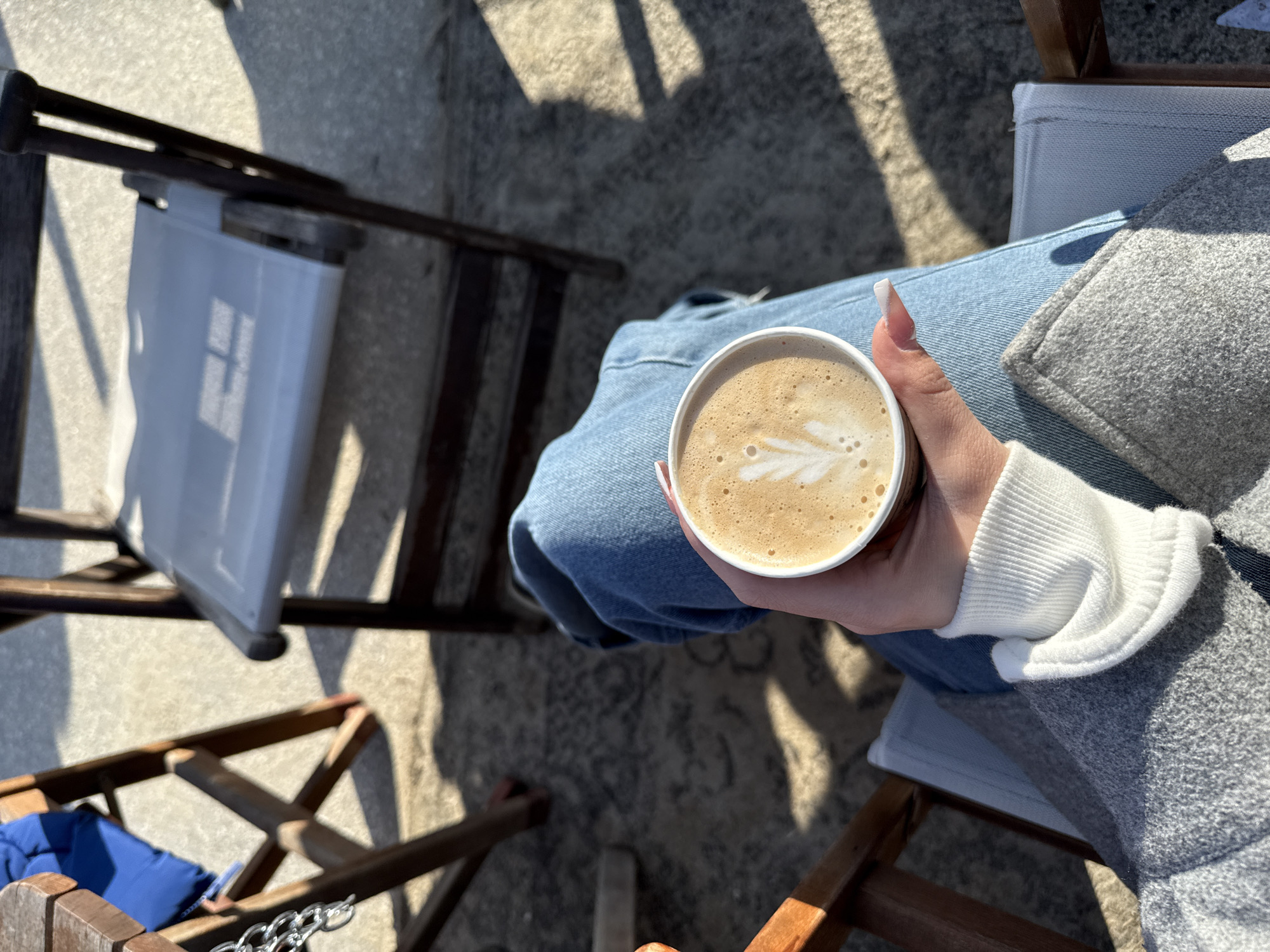 A person's right hand, displaying long fingernails with white tips, holds a disposable coffee cup containing a beverage with white leaf-patterned latte art. The individual is seated outdoors in a light grey canvas sling chair with a dark wooden frame, wearing light blue denim jeans, a white long-sleeved top, and a grey textured coat draped over their lap. To the immediate left, a portion of another wooden chair or table leg with a blue cushion is visible. To the right, an empty light grey canvas sling chair with a dark wooden frame is partially present. The ground surface is a rough, dark grey concrete or paved material. Strong, angular sunlight casts defined shadows across the scene. The location is Varna, Bulgaria.