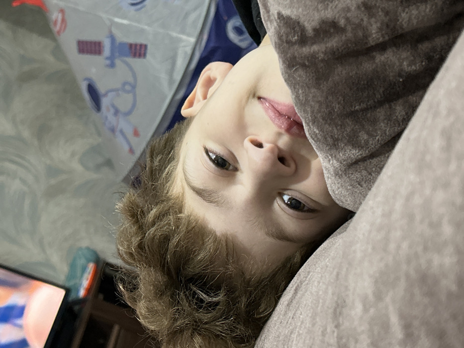 The image presents an indoor scene located in Noviy, Russia. A young individual, identified by light brown curly hair and light-colored eyes, is the central subject, lying down with their head resting on a light beige pillow. The individual looks directly towards the camera, displaying a slight smile with a visibly moist lower lip. A dark grey or brown blanket partially covers the individual's body. In the background, to the upper left, a television screen is visible, displaying blurred orange and blue content and resting on a dark piece of furniture. The wall behind the subject is adorned with light-toned wallpaper featuring a subtle, wavy pattern. To the right of the subject's head, a light-colored play tent or structure is partially visible, decorated with space-themed illustrations, specifically an astronaut and a satellite, above a dark blue base.