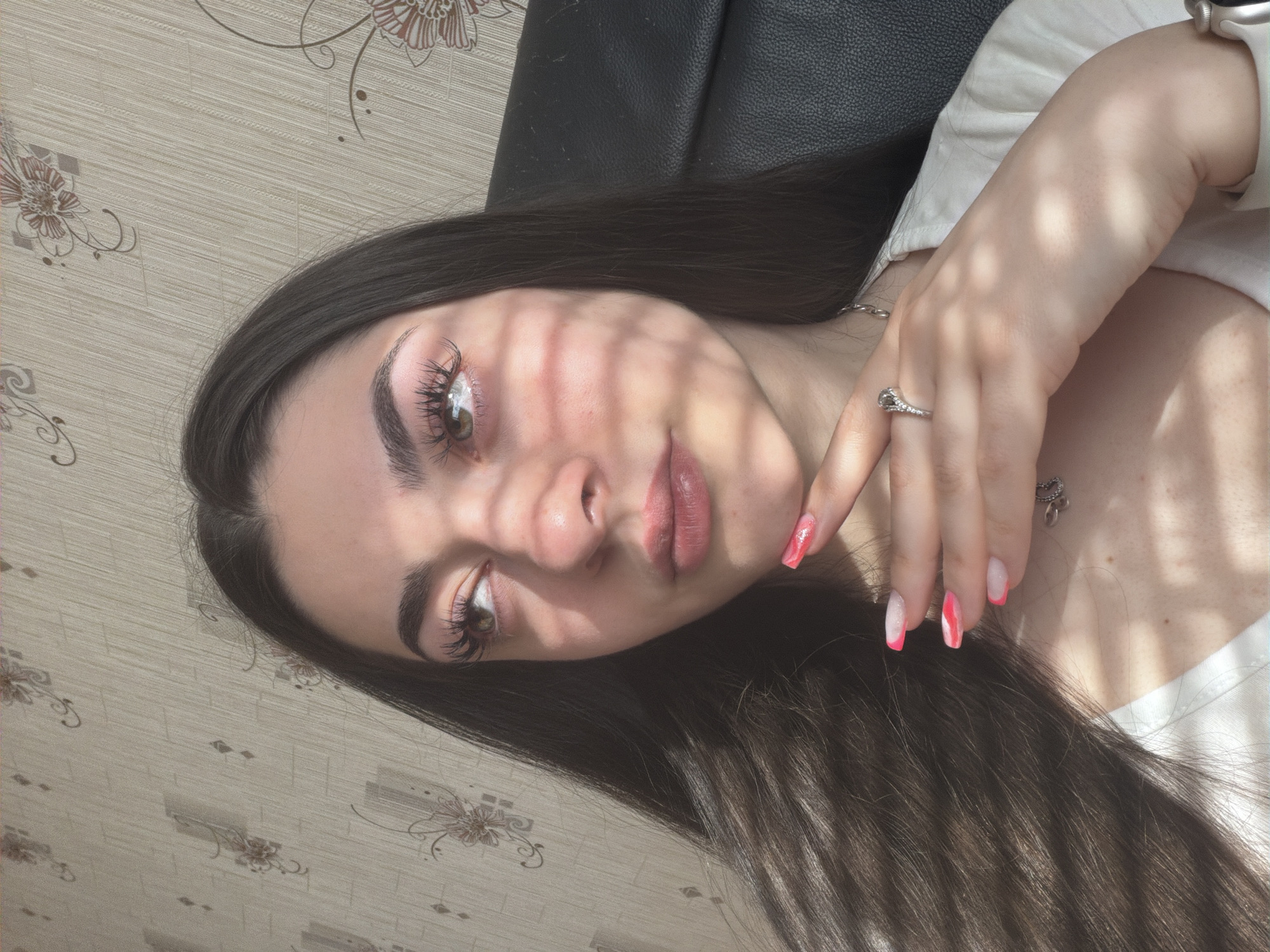 A young woman with long, dark hair is positioned in front of a patterned wall. Her face is partially obscured by shadows, creating alternating bands of light and dark across her face. Her eyes are visible, and she is wearing makeup. Her hand, adorned with a ring, is near her face. She is wearing a white top. The background includes a wall with a floral pattern and a dark-colored object, possibly a piece of furniture. No details suggest the image was taken in Shumen, Bulgaria.