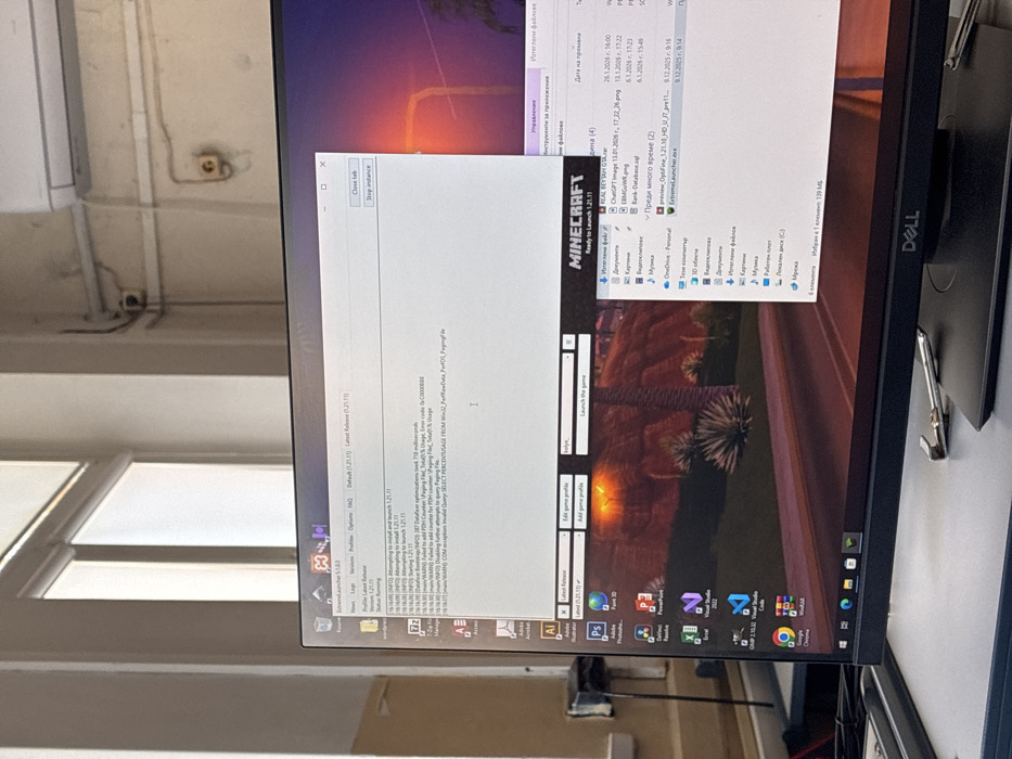 The scene is set in an institutional environment in the city of Plovdiv, Bulgaria, characterized by a light-colored wall with visible electrical conduit and wall sockets, a large multi-pane window on the left admitting bright natural light, and a white wall-mounted air conditioning unit in the upper right. The primary subject is a black Dell computer monitor displaying a Windows desktop. The monitor prominently features the "ExtremeLauncher 5.1.0.3" application window, displaying log messages indicating "Attempting to install and launch 1.21.11" with multiple warnings and errors, including "Failed to add PDH Counter for Paging File" and an "Invalid Query SELECT PERCENTUSAGE FROM Win32_PerfRawData_PerfOS_PagingFile." Below the logs, a section for "Minecraft Ready to Launch 1.21.11" is visible. The desktop background is a landscape with red-brown terrain, palm trees, and a bright light source on the horizon, possibly a sunset, with a road in the foreground. To the right of the launcher window, a partial view of a File Explorer window displays file names in Bulgarian and English, including "REAL BEYRAH GTA.rar," "ChatGPT image 13.01.2026.cr," and "preview_OptiFine_1.21.10_HD_U_J7_pre11," with corresponding dates such as 26.1.2026 and 9.12.2023. The Windows taskbar is visible at the bottom of the screen, showing icons for applications such as Google Chrome, Visual Studio Code, Microsoft Excel, PowerPoint, and Adobe Creative Suite programs. A silver metal tool, resembling pliers or a wrench, rests on the black base of the monitor stand. No individuals are visible within the frame.