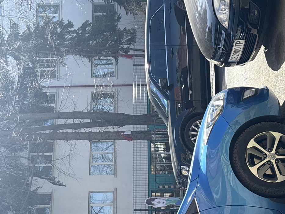 The image depicts an outdoor daytime scene in Elin Pelin, Bulgaria, under bright sunlight which creates sharp shadows on the paved ground. In the immediate foreground, the front-left fender and wheel of a blue Hyundai hatchback are visible. To its right, the front portion of a black Opel Astra H is partially visible, displaying Bulgarian license plate "CB 2900 TP," confirming the Sofia region origin. A black stretch limousine, resembling a modified Chrysler 300C with heavily tinted windows, is parked parallel behind the foreground vehicles. A grey metal fence separates the street or parking area from a large, light-colored, multi-story building in the background, which features numerous reflective windows. Several trees, including bare deciduous and evergreen conifers, are positioned between the fence and the building. Two prominent tree trunks directly behind the fence are adorned with traditional red and white fabric Martenitsi. A cutout of a cartoon boy is visible behind the fence on the left side. No individuals are clearly discernible.