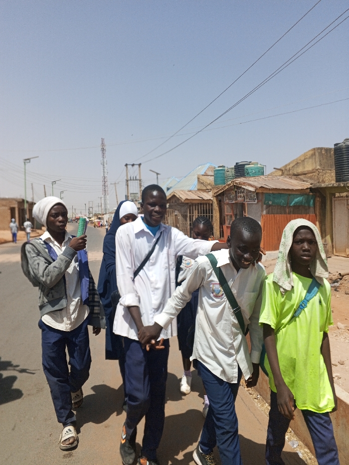 The image depicts a daytime street scene in Gombe, Nigeria, showing a group of six young individuals, likely students, walking along a paved asphalt road