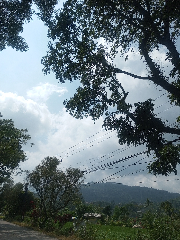 The image depicts a rural or semi-rural landscape in the city of Unknown, Vietnam, under a partly cloudy sky with prominent cumulus formations. The upper portion of the frame is dominated by the dark, dense foliage and branches of several large trees, notably a mature tree on the right exhibiting epiphytic growth. Below the tree line, multiple black utility or communication lines traverse horizontally across the midground. A utility pole supporting these lines is partially visible on the left. A small, dark-clad human figure is positioned on one of the utility poles or lines in the mid-left portion of the midground. The lower left of the frame shows the edge of a dark, unpaved road or path. The midground features lush green vegetation, consistent with agricultural fields or overgrown terrain, interspersed with smaller trees and bushes. Within this vegetation, a small, single-story structure with light-colored walls and a dark, possibly corrugated metal, roof is visible. Near this structure, a white, round object, resembling a satellite dish, is partially obscured by foliage. The background consists of a range of verdant, densely forested hills or mountains stretching across the horizon. A distinct linear feature, potentially a road or development, is discernible along the ridge of the highest visible mountain. No overt actions or interactions beyond the presence of the individual on the utility line are clearly depicted.