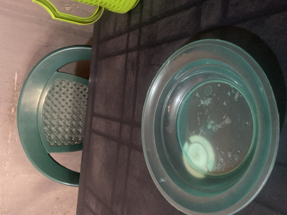 The image depicts an indoor scene in Jos, Nigeria, focusing on a dark brown plastic table. In the foreground, a translucent teal plastic plate rests on the table, containing a small amount of murky liquid with whitish, possibly creamy, residue at its base, indicative of post-consumption remnants. A dark green plastic chair with a woven backrest is positioned behind the table, partially visible on the left. To the right, a bright lime green plastic jug or pitcher with a ribbed texture is partially visible on the table. The background consists of a light brown or beige wall, appearing to be concrete or painted, showing minor wear. No individuals are present in the scene.