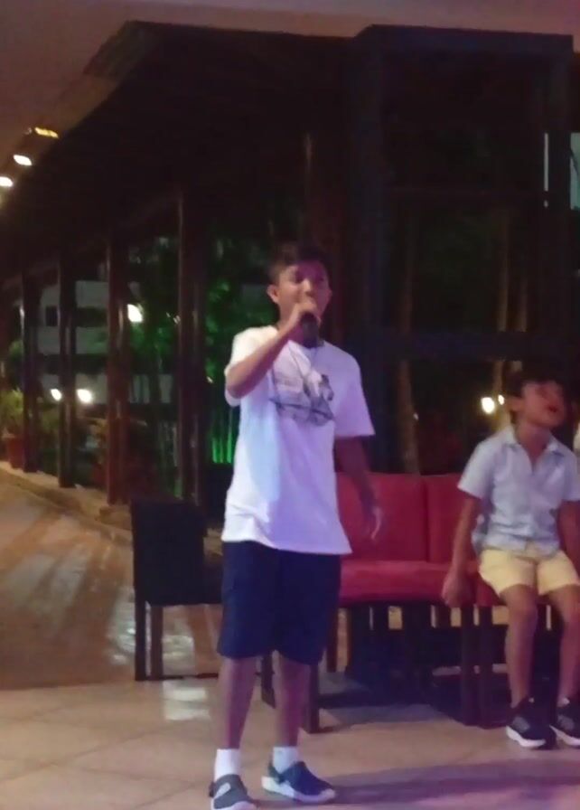 A young boy, probably around 10-12 years old, is standing on a tiled floor and singing into a microphone. He is wearing a white t-shirt, dark blue shorts, and dark sneakers with white socks. Behind him is a low red sofa, and to his right, another boy is sitting on the sofa. The setting appears to be an outdoor patio or covered walkway, possibly at a resort or hotel. The structure has a dark wooden frame and is lit with string lights. In the background, other people and plants are visible. The overall lighting is dim. The camera remains steady throughout the video. There is also a pink light on the floor.