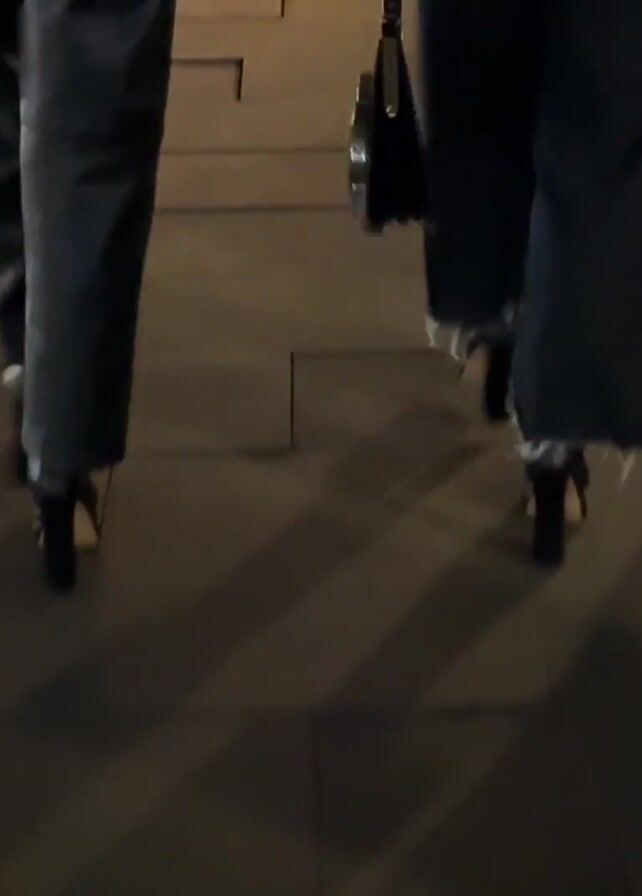 Three individuals are walking on a dark sidewalk constructed from large, rectangular pavers. The camera is positioned behind them, focusing on their legs and feet. The person on the left wears dark pants and high-heeled shoes. The middle person wears blue jeans with a fringed hem and high-heeled shoes. The person on the right wears black pants and Adidas sneakers. The shadows of the individuals are visible on the pavement, cast by a light source above and slightly behind them. The edge of a grass area is visible on the far left.