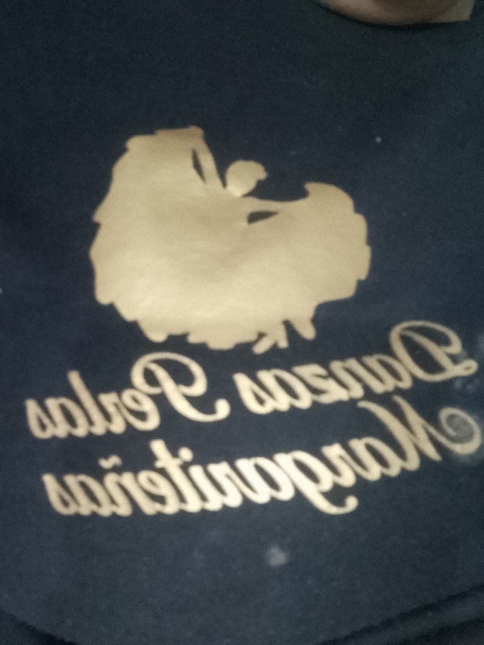 A navy blue garment features a light tan design. The design consists of a silhouette of two people ballroom dancing, positioned above cursive text reading "Danzas Perlas Margarita." The text appears to be upside down.