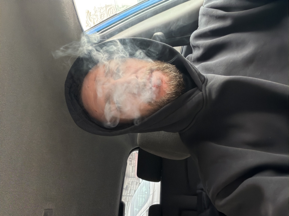 An individual is depicted seated in the driver's position within a passenger vehicle in Rostov-on-Don, Russia. The subject, an adult male, is wearing a dark-colored hooded sweatshirt with the hood up, obscuring the forehead and hair. A reddish-brown beard is visible on the lower face. A substantial plume of white smoke is actively being exhaled from the mouth, partially obscuring the nose and eyes. A faint red discoloration is present on the lower lip area. The vehicle's interior features a light grey headliner and the upper portion of a light grey seatback/headrest on the left. The driver's side door panel, visible on the right, is blue. Through the rear left window, a light-colored sedan is parked parallel to the subject's vehicle. Behind this car, a building is visible, featuring a red sign with white Cyrillic characters, specifically "ПИРО" is discernible. Through the front right window, exterior architectural details of a building facade are evident.
