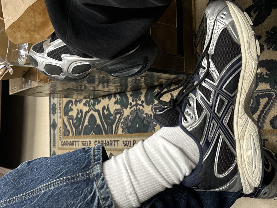 The scene is an interior view within a Carhartt WIP retail establishment in Paris, France. Two individuals are present, depicted from the lower legs downwards. On the left, one individual wears blue denim jeans, white ribbed crew socks, and a black and silver ASICS running shoe with "GEL" branding on the sole. Their foot rests on a patterned rug covering the floor. This rug features a beige, green, and cream ornamental design with "CARHARTT WIP" text repeated vertically along a border. On the right, the second individual wears black pants or sweatpants and a silver and black athletic shoe with distinctive silver paneling. Their foot is positioned on a dark, glossy wooden surface, likely a low table or chest. A clear glass containing water and a brown paper bag are also visible on this wooden surface. The overall environment suggests a casual, relaxed indoor setting.