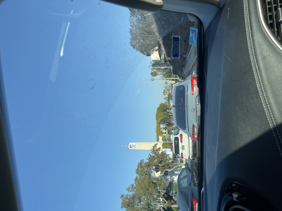 Seen through a car windshield, traffic is at a standstill on a sunny day. A light grey Honda is directly in front, followed by a white van. Further ahead, a tall, rectangular church tower with a cross on top rises above the trees. Streetlights and buildings line the street. The dashboard of the car fills the right side of the frame.