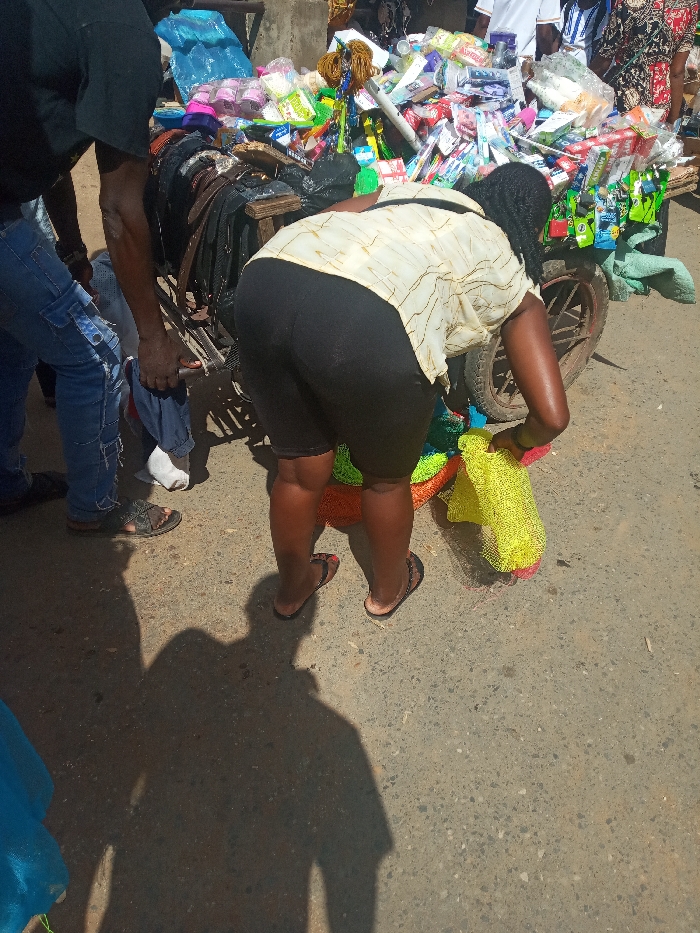 The image depicts an outdoor street scene in Nkwelle, Nigeria. A dark-skinned individual, wearing a cream-colored patterned short-sleeved top and black shorts, is bent at the waist, reaching toward several brightly colored mesh items (yellow, green, orange, red) resting on the gray asphalt ground. This individual wears dark flat sandals. Their right hand is grasping a yellow mesh item. To the left, a second person is partially visible, wearing blue denim jeans and dark sandals, standing near a mobile street vendor's cart. The prominent shadow of this individual is cast on the asphalt. In the background, a two-wheeled cart is heavily laden with various packaged consumer goods, including numerous small plastic items, toiletries, and household products, suggesting a market stall. Additional indistinct figures are visible further in the background. The scene is illuminated by strong daylight, indicated by sharp shadows.