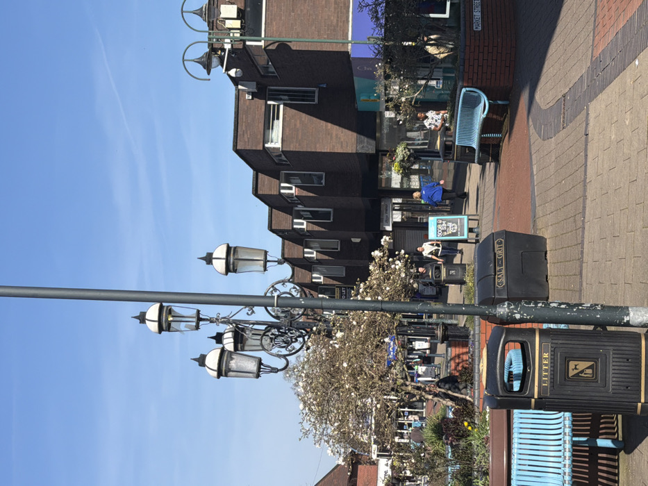 This image captures a bright, sunny day in a pedestrianized public area in Crewe, United Kingdom, specifically near Market Street, indicated by a street sign visible on the right. The foreground is dominated by a tall, dark grey lamppost with an ornate four-lantern fixture; each lantern features a white dome and dark metal framework, with one lantern exhibiting a cracked glass panel. To the left of the lamppost, a light blue slatted metal bench is positioned next to a black "LITTER" bin displaying a dog waste symbol. To the right of the lamppost base, a black "SALT - GRIT" bin is present. The ground is paved with multi-toned block pavers in grey, brown, and reddish-brown patterns. In the midground, two trees with white blossoms are situated within low brick planters. Beyond these, a pedestrian walkway extends into the background, flanked on the right by a continuous structure of brown brick commercial buildings. These buildings feature multiple levels, characterized by sloped sections and regularly spaced vertical, angled windows. Shopfronts are visible at ground level, with one featuring a partial "High Street" sign and another "TO LET" sign. Several individuals are present on the walkway. A person wearing a blue top and dark trousers walks away from the viewer, centrally located. Behind them, another individual in a white top with dark trim walks towards the camera. Further right, a person in a patterned short-sleeved shirt is seated on a light blue slatted metal bench situated on a raised brick planter. An A-board sign displaying "50GB SIM £13" stands near the walkway. Another street light with two arched lamps is visible on the far right. The sky above is clear and blue.