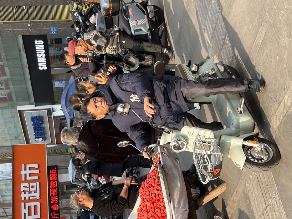 This image captures a street scene in Jiangjin, China, under bright daylight, evidenced by distinct shadows. In the foreground, a middle-aged Asian male sits on a light green electric scooter, hands on the handlebars. He wears a dark blue puffer jacket with a white "NY" logo on the left chest, dark trousers, and black shoes, with a neutral to slightly stern expression. The scooter has chrome rearview mirrors and a white wire basket mounted to the front. To his immediate left, a wooden vendor's cart is laden with a large pile of bright red strawberries. An Asian male in a black long-sleeved shirt leans against this strawberry cart, looking left. In the midground, several pedestrians are present. Behind the man on the scooter, an Asian woman holds a light-colored smartphone, appearing to take a photo or video. To her right, an Asian male wearing a red cap and a patterned, multi-colored sweater stands beside a blue electric scooter, facing right. Further back, an Asian male with grey hair, wearing a dark brown, fur-collared coat, stands with his back partially to the camera. The street is lined with numerous parked electric scooters and motorcycles. The background consists of commercial buildings featuring multiple storefronts. Prominent signage includes an orange sign for "百超市" (Bai Chaoshi - Hundred Supermarket), a blue sign for "百电器" (Bai Dianqi - Hundred Electric Appliances), and a large black sign displaying "SAMSUNG" in white lettering. The ground is paved, indicating a busy urban commercial area.