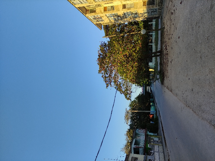 A street scene with a long, gray asphalt road. Tall building at the top corner with a mix of beige and cream color. Scattered trees alongside the road, some with lush green and reddish leaves. Clear blue sky covers most of the image. Utility lines crisscross the sky above the street. Buildings are present along the bottom, showing signs of varying designs and light colors.