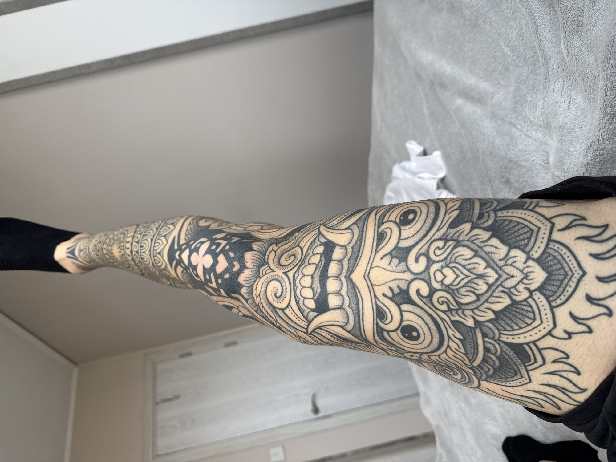A person's leg is visible, heavily tattooed in black ink with intricate patterns, featuring tribal and ornamental designs