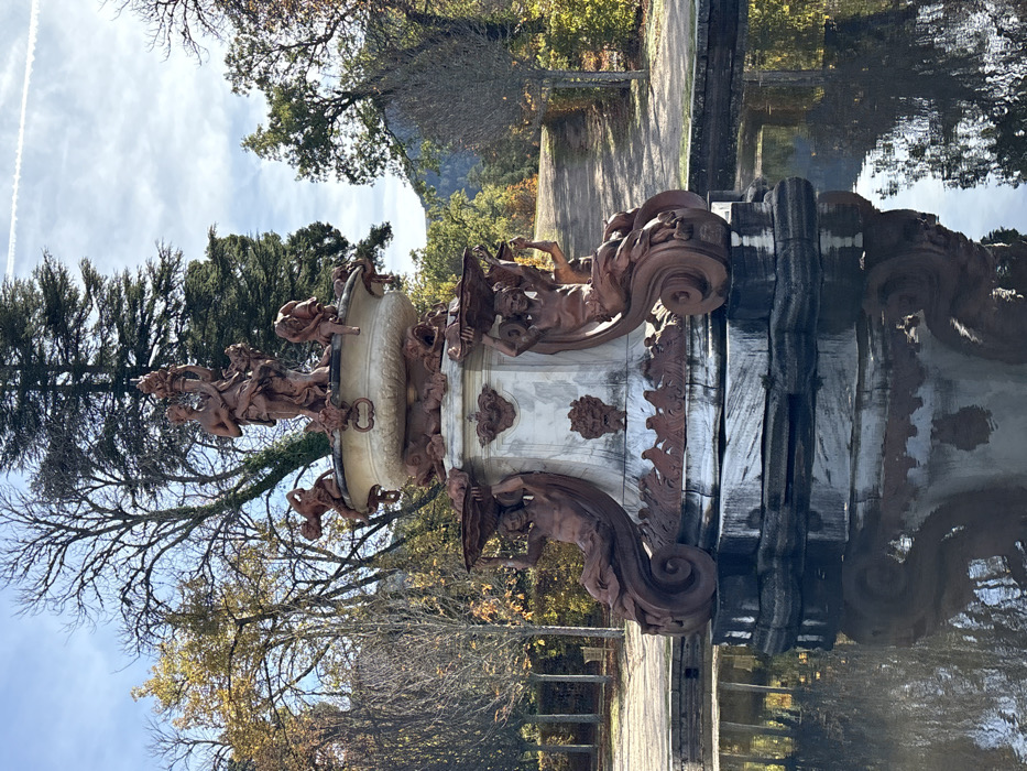 - "A multi-tiered, elaborate Baroque-style fountain, composed of reddish-brown/bronze sculptures and white/grey variegated marble, stands centered within a calm, dark reflecting pool in the gardens of San Ildefonso, Spain" by FM-E1hwL2, licensed under CC BY 4.0