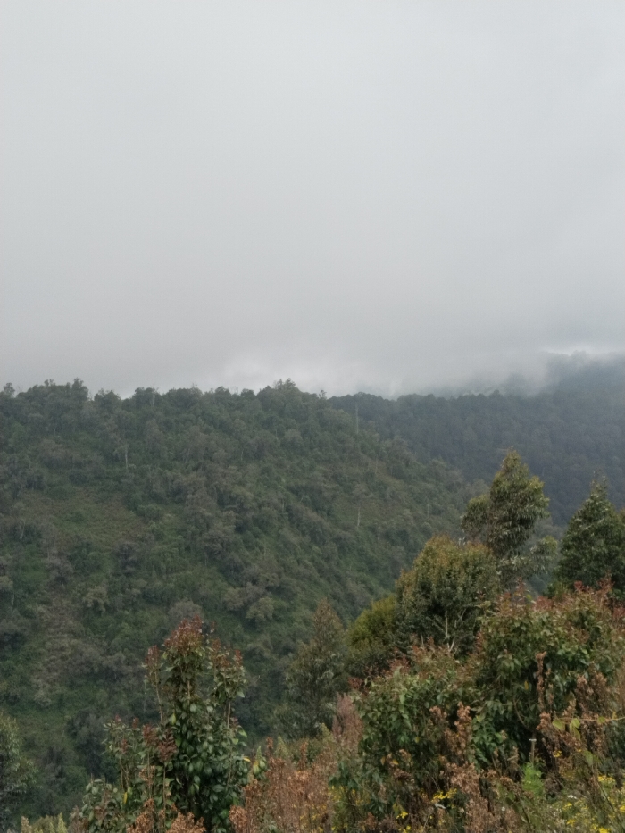 The scene depicts a heavily forested mountainous landscape in the city of Unknown, Kenya, under overcast conditions. The immediate foreground features a mix of green shrubs and trees, some with brownish-red foliage. Beyond, dense green tree cover blankets steep hillsides that recede into the distance. A layer of low-hanging fog or clouds partially obscures the upper reaches of the distant hills and merges with the uniformly light grey sky. No individuals, animals, or man-made structures are visible.