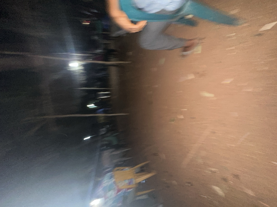 A blurred image shows an outdoor scene at night. People are present, with one person in the foreground wearing a teal shirt and gray pants. The ground is dirt, scattered with what appears to be debris. In the background, there are rows of seats and poles with lights, suggesting an event or gathering. A yellow chair is visible in the lower portion of the frame.
