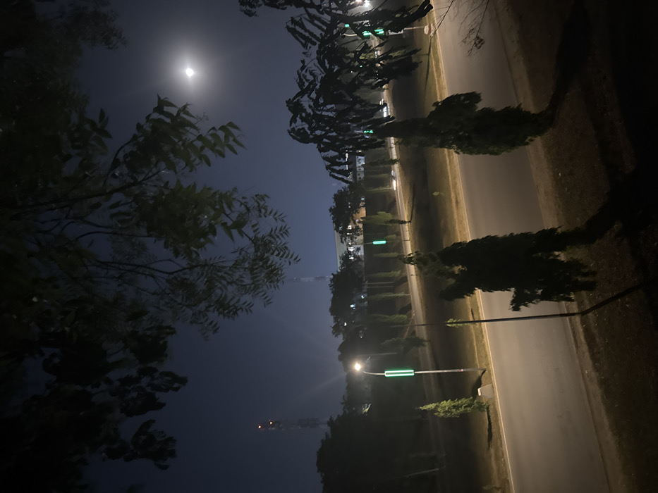 Night scene of a road lined with trees and illuminated by streetlights. In the distance, a tall structure is faintly visible, partially obscured by fog. The sky is dark with a prominent moon. Trees in the foreground are silhouetted. The photo is taken from an elevated position, creating a perspective looking down along the road. The scene evokes a sense of quiet solitude and nocturnal atmosphere.
