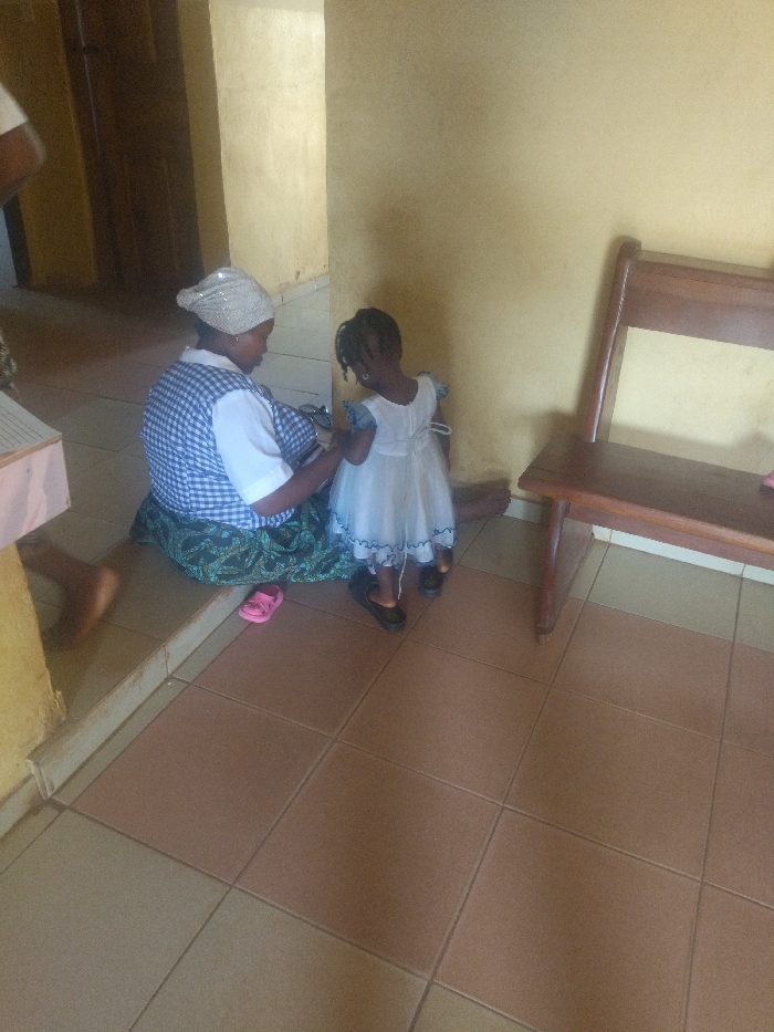 A woman in a blue and white plaid dress and a white head covering is seated on the floor, helping a young girl in a white dress put on her shoes. The girl is standing and the woman is helping her. There is a wooden bench to the right of the image. They are in the hallway of a building in the city of Tuoniako, Nigeria, located at coordinates 7.462 latitude, 7.157 longitude. The floor is tiled, and the walls are painted a light yellow. The woman appears to be helping the girl to get ready for an event. The light is coming from the top of the image, creating shadows in the room. The image was captured using a mobile phone.
