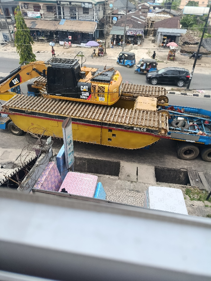 An elevated viewpoint captures an urban street scene in Warri, Nigeria, during daylight hours. The central focus is a large yellow CAT 320D excavator, configured as an amphibious or swamp buggy with extended pontoons, mounted on a custom yellow "WILCO" pontoon base. This entire assembly is loaded onto a blue multi-axle flatbed trailer, positioned on a paved road. To the right of the heavy transport, a black SUV drives past, and two motorized tricycles (Keke Napep), one blue and one dark, are also on the road. Several pedestrians are visible on the sidewalks and near roadside stalls. The background features a densely packed array of commercial and residential buildings, primarily one to two stories high, with a mix of concrete and corrugated metal roofs. A tall, slender green tree stands on the left side of the road. Multiple small market stalls with open fronts are visible along the street, some with colorful umbrellas providing shade. In the immediate foreground, from the vantage point of the photographer, a white ledge or railing obscures the lower portion of the scene. Below this railing, several brightly patterned foam mattresses (pink, blue, and white) are stacked or displayed on the ground, adjacent to a section of barbed wire coiled on a low wall and a partially obscured white sign with blue text. A concrete drainage ditch runs parallel to the road in this area.