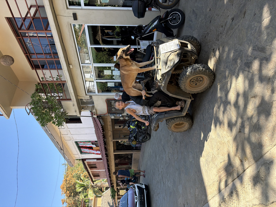 The image captures a street scene in Mazunte, Mexico, under clear, bright daylight. In the immediate foreground, a dark-colored, four-wheeled All-Terrain Vehicle (ATV) is positioned on a paved, textured street surface. A tan or light brown dog, appearing to be a shepherd breed, stands on the ATV's seat with its hind legs, while its front paws rest on the handlebars. Its mouth is open with its tongue extended. An older male individual, characterized by short, light-colored hair and wearing a light-colored tank top and dark shorts or pants, is seated on the left side of the ATV, looking towards the left of the frame. His left hand is positioned on the ATV's frame, and his feet appear bare or in sandals. A second individual, whose upper body is largely obscured by the dog, is seated on the right side of the ATV, appearing to operate the vehicle; a leg clad in dark trousers is visible. To the right of the ATV, a two-story building with a light beige stucco facade features large glass storefront windows on its ground floor. The second floor includes a balcony with a brown metal railing and a potted tree. A spherical woven light fixture hangs from the balcony's overhang. Several motorcycles and scooters are parked along the curb adjacent to this building. Further down the street on the left, a white sedan is partially visible, and several pedestrians are present on the sidewalk. Various buildings with differing architectural styles, including a structure with a red corrugated metal roof and another with a thatched roof, line the street. A verdant hillside, partially covered with trees displaying reddish-orange foliage, forms the backdrop beneath a clear blue sky. Shadows from unseen overhead objects or structures are cast onto the street in the foreground.