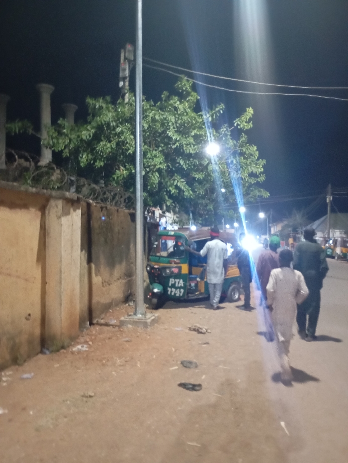 At night, several people stand near a green and yellow auto-rickshaw with "PTA 7747" on its side. They are on a street lit by streetlights. A tan wall topped with barbed wire runs along one side of the street. Behind the wall, greenery is visible. A utility pole stands near the auto-rickshaw. The road surface appears to be a mix of asphalt and dirt.
