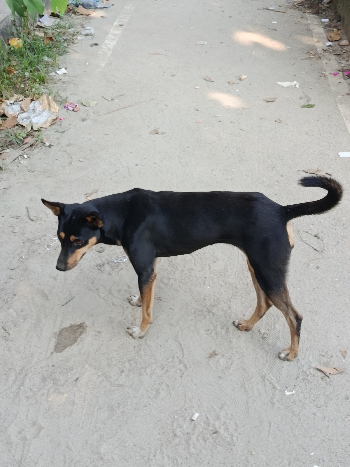 - "A medium-sized, lean black and tan street dog stands centered on an unpaved, light grey-brown ground surface in a typical residential or semi-urban area of Dhaka, Bangladesh" by FM-1YwHv2, licensed under CC BY 4.0
