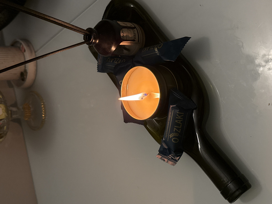 The scene is an interior view within the city of Unknown, Unknown, displaying a collection of objects on a light-colored, reflective surface. A dark green, flattened glass bottle serves as a tray, holding a lit metallic-encased candle with an orange flame as its central element. To the right of the candle, a dark glass reed diffuser bottle, partially labeled "ENJOY PERFUME," contains multiple dark reed sticks. Several individually wrapped dark blue candies, each marked "O ZLAKI" and "КУПАЖИРОВАННАЯ КОНФЕТА" in gold text, are arranged on the bottle-tray. In the blurred background, a clear glass pedestal bowl with gold accents and a cream cylindrical object are visible. The primary illumination originates from the candle flame.