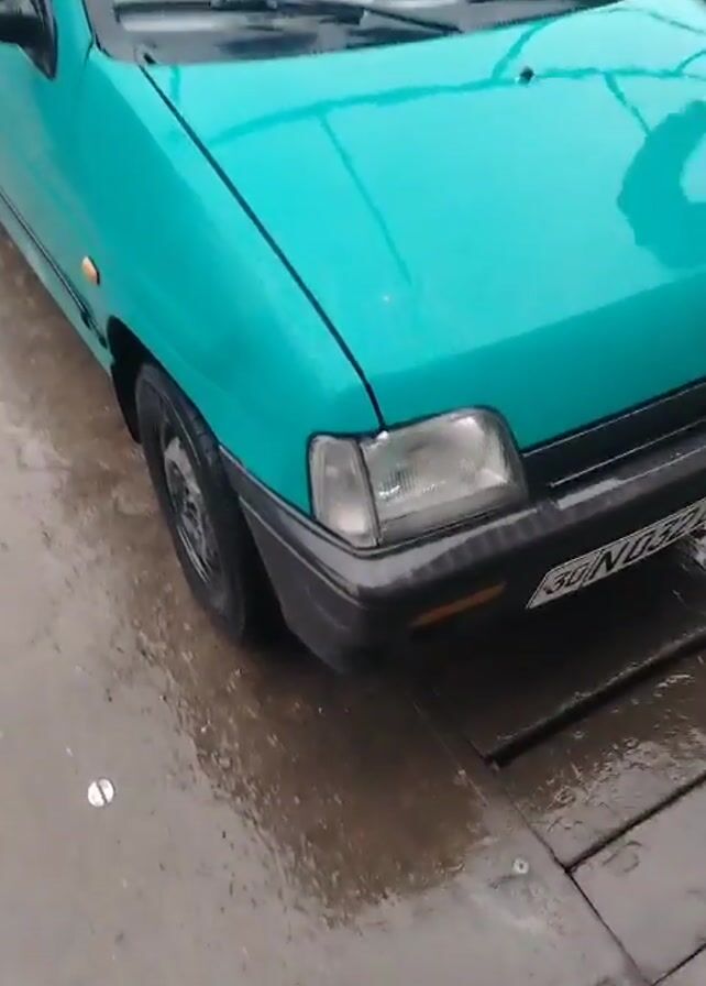 light turquoise-colored car in what appears to be an outdoor car wash area