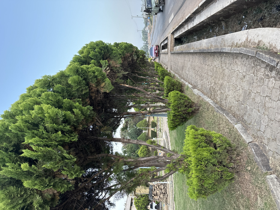 A row of evergreen trees lines a street, with smaller, trimmed shrubs underneath. A paved, curving walkway separates the trees from the road, alongside a concrete drainage ditch. Vehicles are seen on the asphalt road. In the distance, rounded shrubbery is visible in a park-like setting. Below the trees, there's a patch of grass and stacked stones near a white car. The sky is clear and blue.