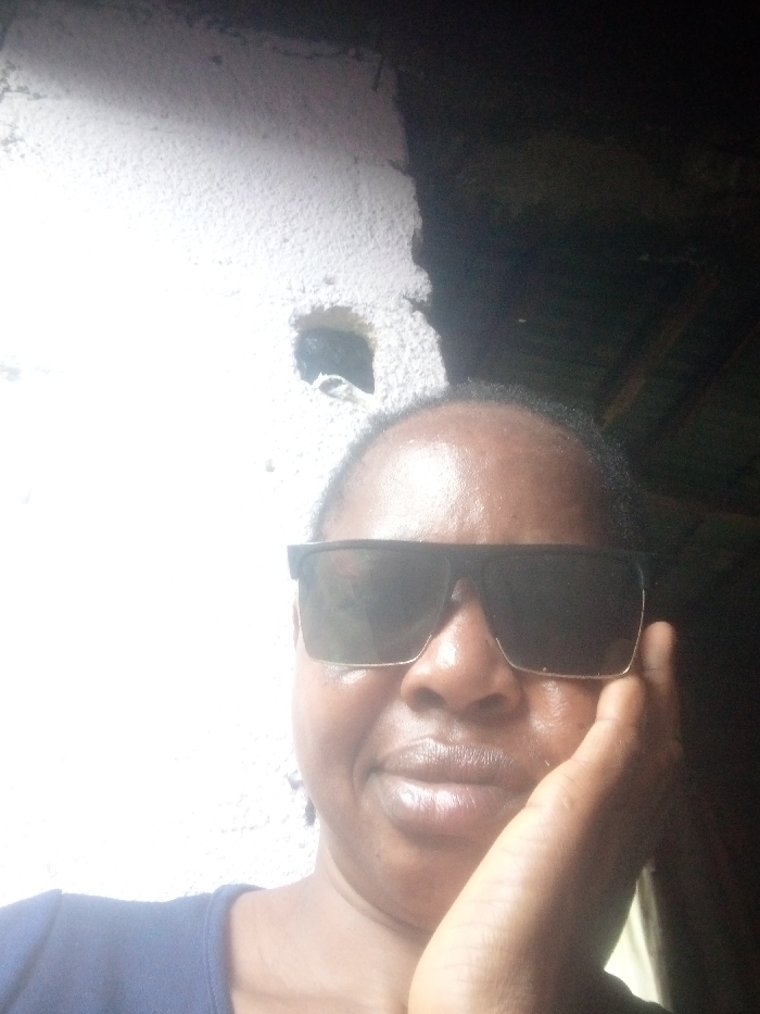 A person with dark skin is depicted in a close-up, informal portrait, positioned towards the lower right of the frame