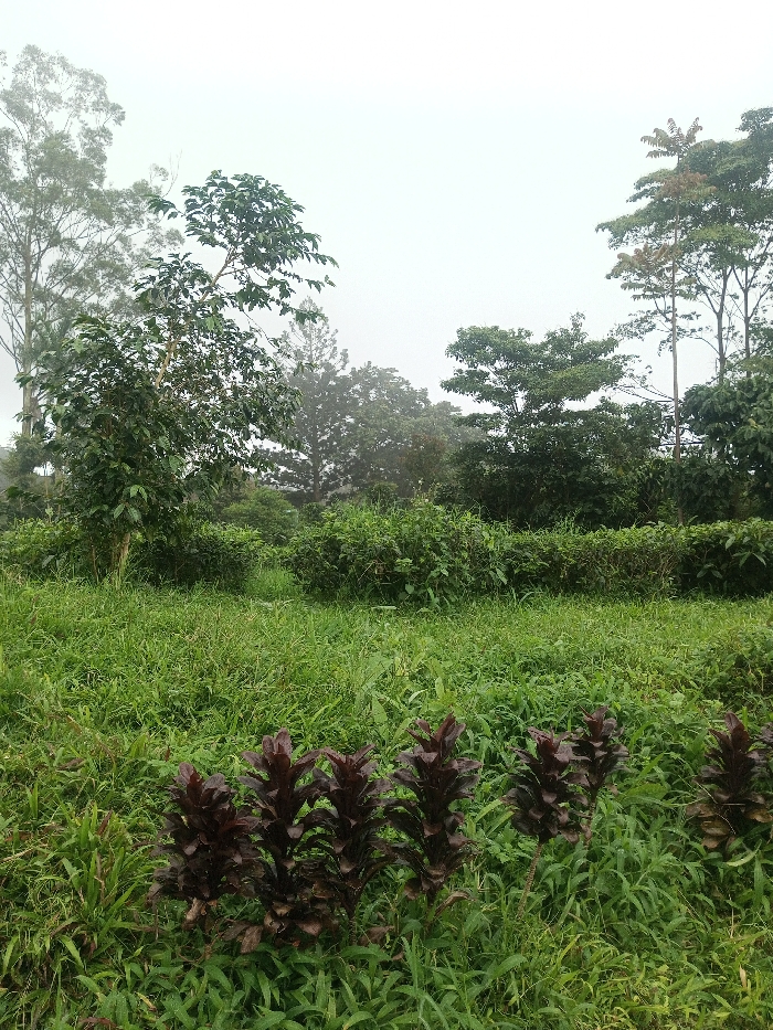 The image displays an outdoor, natural landscape in Irupalai, Sri Lanka, under heavily overcast or foggy conditions. In the immediate foreground, a partial row of approximately five dark red/burgundy leafy plants, possibly ornamental, stands amidst a dense ground cover of vibrant green grass and various green weeds. The midground consists of an expansive, unmanicured area of green grass and assorted low-lying green shrubs. The background is dominated by a dense arrangement of tall trees, including species with lighter and darker foliage, all partially obscured by a pervasive white-grey fog or mist that envelops the upper portions of the trees and the sky. No individuals, animals, or man-made structures are visible.