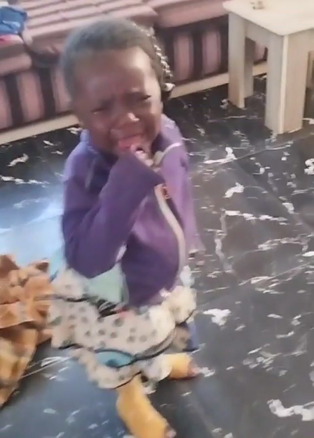 A toddler is crying in a room with a black-and-white marble-patterned floor