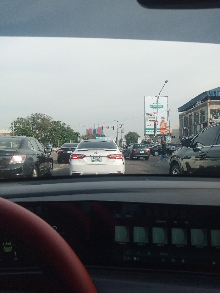 The image displays an urban street scene viewed from within a vehicle, looking forward through the windshield on an overcast day. In the foreground, the upper edge of a dark dashboard is visible, along with the lower section of a digital instrument cluster or infotainment screen. The screen shows "Radio," "Collection," "FM," "AM," several circular graphic elements, and a temperature reading of "21.5°C." A portion of a red, textured steering wheel rim is visible on the lower left. The midground features congested vehicle traffic on a multi-lane asphalt road. Directly ahead is a white Toyota Camry sedan with a license plate reading "AC-306JI." To its left, a dark Honda Accord sedan is visible. Other sedans and an SUV are present in various lanes, appearing either stationary or moving slowly. A single pedestrian, wearing dark clothing and light trousers, is crossing the street from right to left. Multiple red traffic signals are visible in the distance, indicating a stop. The background includes multi-story commercial buildings on the right side of the road, one with a distinctive blue roof. A large vertical billboard stands prominently on the right, displaying advertisements, including one with a person holding a food item. On the left, a dense cluster of green trees is visible. Utility poles, streetlights, and overhead power lines are also present throughout the scene. The location is an unnamed city and region.