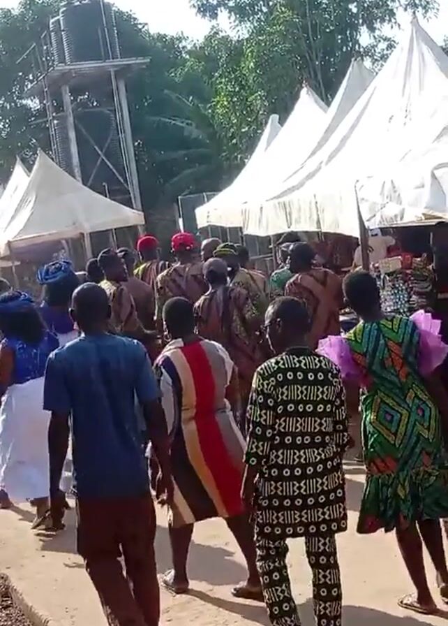 crowd of people walking on a paved pathway lined with white tents. The people are dressed in a variety of clothing, including traditional African prints and modern outfits. One man carries a stack of items wrapped in colorful fabric. Another man carries a white bucket. In the background, there are trees and a water tower. People appear to be headed towards the tents. Music is playing.