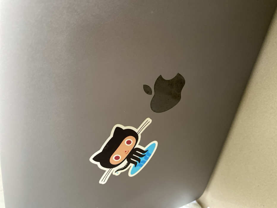 A dark gray Apple laptop lid is depicted from an elevated, oblique angle, resting on an unidentifiable light-colored flat surface. A sticker featuring the GitHub Octocat, a black, tentacled cat character on a blue surfboard, is affixed to the upper-left quadrant of the lid. To the right, the embedded black Apple logo displays darkened areas consistent with smudging or surface wear. No individuals are present in the frame. The immediate environment does not contain visual identifiers to confirm its location within Lhokseumawe, Indonesia.
