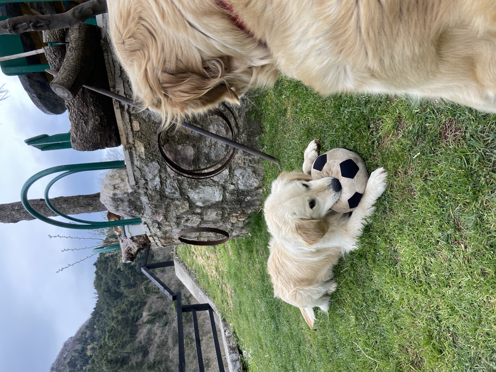 two golden retrievers on a grassy lawn. One retriever is a puppy playing with a plush soccer ball. The other retriever is larger and partially visible in the upper portion of the image. In the background, there is a stone structure with metal rings, a green metal railing, trees, and mountains. The location is likely in the vicinity of Krapina, Montenegro.