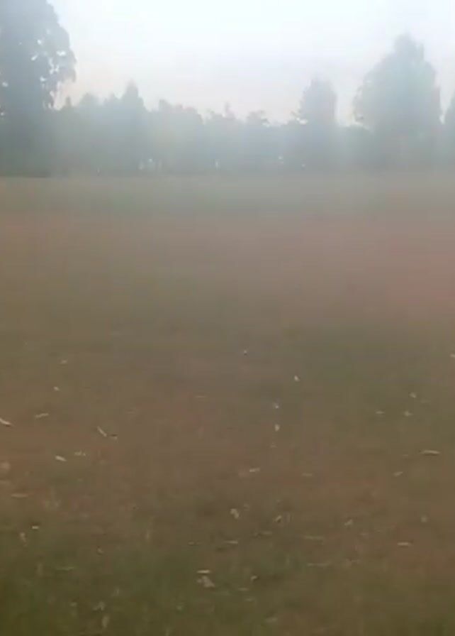 The video depicts a grassy field with sparse patches of dirt and scattered leaves, likely in a park or recreational area. Trees line the perimeter of the field, providing a hazy backdrop against a pale sky. There is a piece of trash on the ground in the lower right corner. A person wearing a light green shirt and dark shorts is jogging across the field from left to right. In the distance, a group of indistinct figures appears to be engaged in some form of activity. The overall visibility is reduced due to a haze or mist in the air.