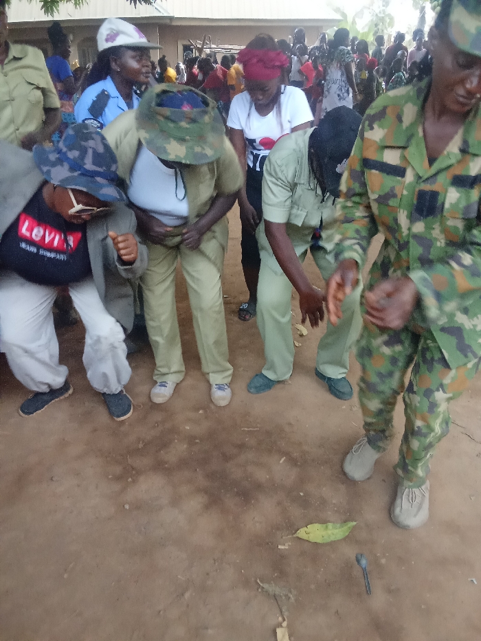 A group of people stand on a dirt ground. Some wear uniforms, including camouflage. Others wear civilian clothes, like a "LEVI'S" t-shirt. Several individuals are bent over, looking downwards. A leaf and a small spoon lie on the ground in the foreground. More people can be seen blurred in the background, suggesting a gathering of some sort.