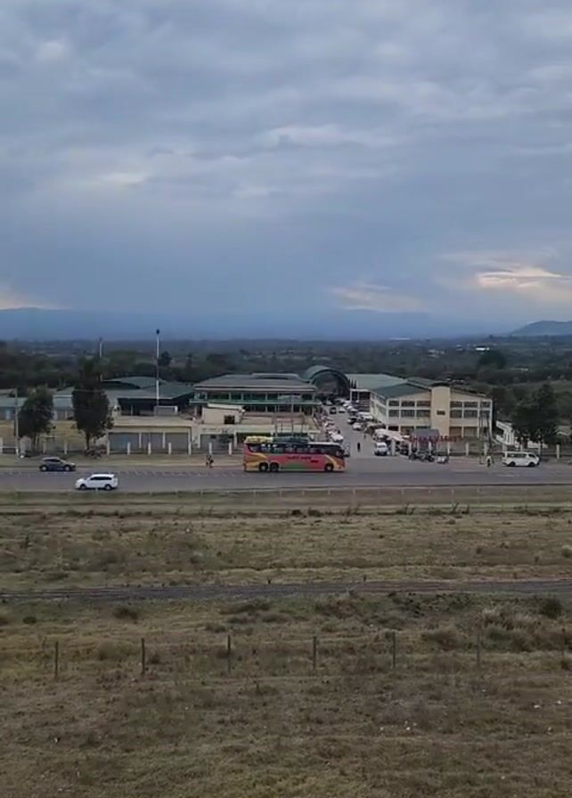 slightly elevated view of a multi-lane road in an open area with buildings, vehicles, and distant mountains. There is a rail line in the middle ground, dividing a grassy field from the road. The road features various vehicles, including a long multi-colored bus, cars, and trucks. In the background, several buildings can be seen, interspersed with trees. On the horizon are mountains under a sky with a cloudy overcast. A portion of a railing is visible in the foreground, indicating the view is from an elevated structure like a balcony or rooftop. A person is walking on the grassy field.