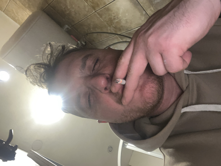 An adult male is depicted in a low-angle, selfie-style indoor photograph. He has messy dark hair and facial stubble, and is wearing a tan-colored hoodie with white drawstrings. His eyes are closed or heavily squinted, and his head is tilted upwards. He holds a lit cigarette between the index and middle fingers of his right hand, positioned near his mouth, with the glowing ember visible. A bright, circular ceiling light fixture causes a strong glare directly above his head. To the right of the subject, a wall covered in light brown square tiles is visible. Mounted on this tiled wall is a white, rectangular tank-like object, possibly a water heater or toilet cistern, partially covered in clear plastic sheeting, with associated piping visible. To the left, a portion of a white vertical structure, potentially a shower enclosure or door frame, is visible. The environment appears to be a bathroom or utility room. The specific location within Liepaja, Latvia, is not discernible from the image content.