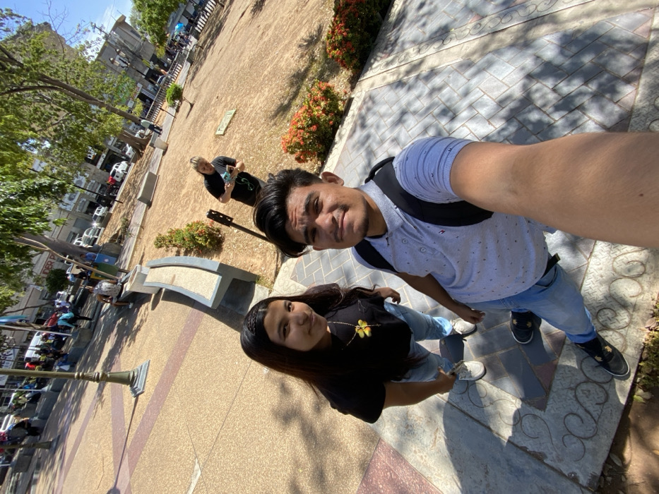 An outdoor, high-angle selfie captured in a public park or plaza in Porlamar, Venezuela, on a clear, sunny day