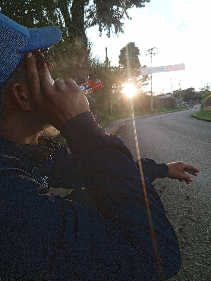 A man in a blue baseball cap holds a lighter to his face as he sits by a road. The sun is shining brightly down the road, with a banner visible further away. The man is wearing a dark blue sweatshirt. The road appears to be slightly elevated and winding. A grassy area is visible on both sides of the road. There are trees in the background.
