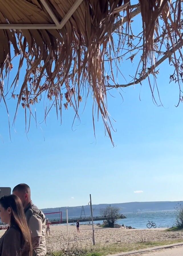 beach scene on a sunny day, filmed from under a thatched umbrella. In the distance, people are playing volleyball on the sand. The camera pans to the right, revealing a sandy path alongside the water, where a bicycle is parked. Further down, two people are sitting by the water's edge. A trash can and several street signs are also visible. The sky is blue with scattered clouds, and the sun is reflecting off the water.