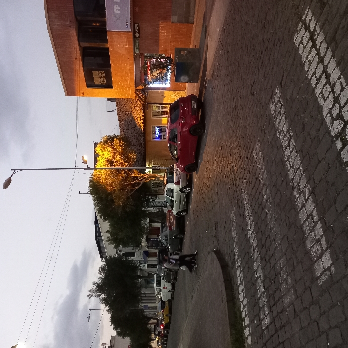 A tilted, street-level photograph shows a cobblestone street lined with parked cars. A red car is parked on the right near a building with a lit store window. Across the street are several other cars, mostly lighter colors, with trees interspersed. Pedestrians are walking on the sidewalk. A streetlight illuminates the scene. The sky is dusky, suggesting twilight. Buildings of varying heights line the street, with some appearing to be illuminated from within.
