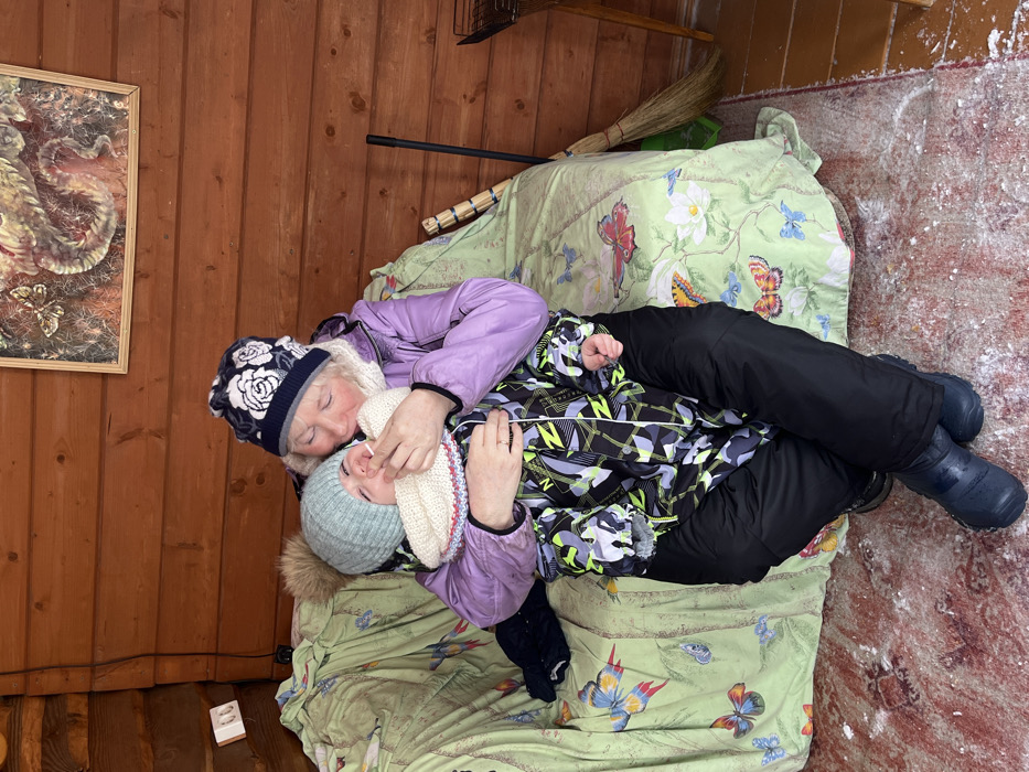 In Italmas, Russia, an adult female and an infant are seated on a green, butterfly-patterned upholstered bench, positioned against a light brown wooden paneled wall. The adult, wearing a purple jacket, a white patterned hat, and a white knitted scarf, embraces the infant, whose head is tilted back. The adult's right hand holds the infant while her left hand is positioned near the infant's mouth, with her face close to the infant's cheek. The infant wears a light blue knitted hat with a pom-pom, a thick cream-colored knitted neck warmer, and a multi-patterned snowsuit over black pants and dark boots. A traditional straw broom leans against the wall to the right of the bench. The floor is covered by a patterned reddish-brown rug with white particulate matter, consistent with snow, scattered across it. A white electrical outlet with a black cord is visible on the left wall. A framed picture featuring an abstract design with a butterfly hangs on the wooden wall above the subjects.