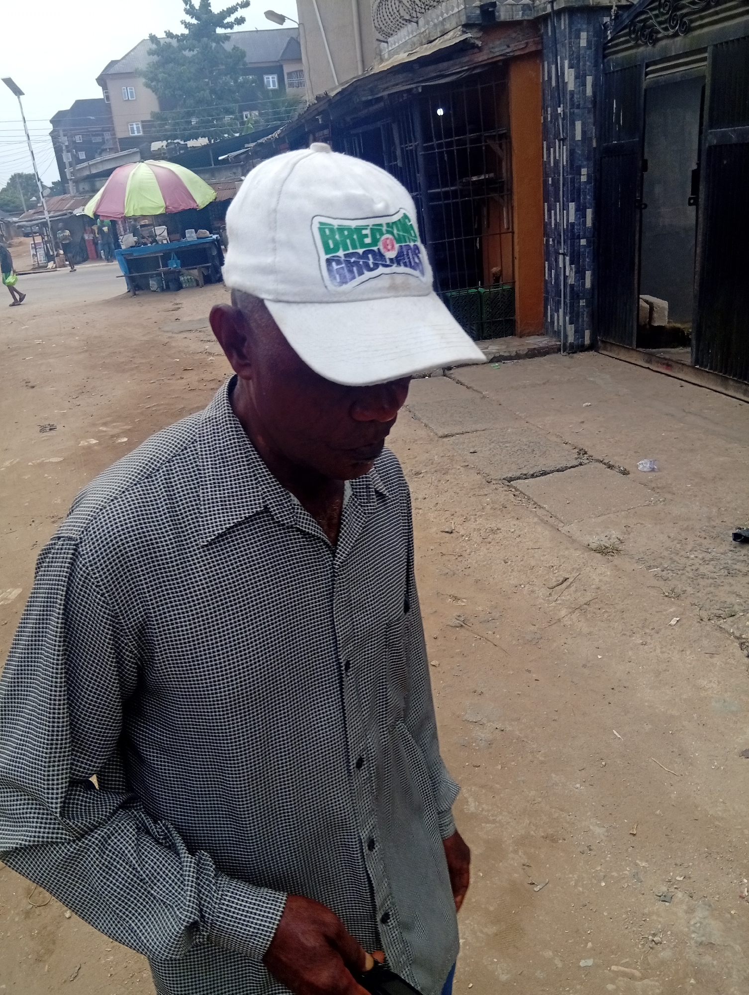 A man in a white baseball cap with green text, wearing a grey checkered button-down shirt, stands on a cracked concrete walkway beside a street in Umuode, Nigeria. He looks down and to his right. Behind him is a building with a metal grille over a window and a dark metal gate slightly ajar. Further back, an umbrella with green and pink stripes covers a vendor's stall, with other people visible in the distance. A street light is visible at the left. The ground is dirt and broken concrete.