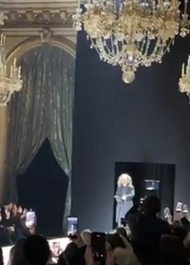 Here's a detailed description of the video: A fashion show is taking place in an ornate hall with crystal chandeliers. A figure with long white hair, wearing a gray coat and hat, walks onto the runway. The person briefly adjusts the hat. The audience, seated on both sides of the runway, is holding up their phones to record the moment. The backdrop is a large, dark wall with a framed section. To the left of the runway, a draped opening is visible.