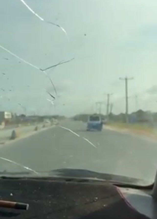The video, shot from the inside of a car, shows a cracked windshield as the vehicle travels on a multi-lane road